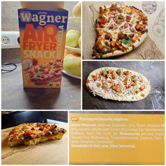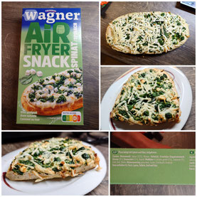 Wagner hat jetzt ein Offenbrot für den Airfryer entwickelt und das in 3 Sorten. Zwei Sorten sind vegetarisch: Mozzarella und Spinat Hirtenkäse. Salami ist die dritte Variante. Sie könne auch im Backofen gemacht werden, aber dann dauert es etwas länger, weil dieser erst auf 220°C vorgeheizt werden muss und dann das Produkt 16 Minuten darin gebacken wird. Beim Airfryer entfällt das Vorheizen und sie brauchen bei 180°C auch nur 11 Minuten. Ich habe nur ein halbes gemacht und die Backzeit auf 8 Minuten verkürzt und das hat ausgereicht. Der Käse ist angebräunt und das Brot außen knusprig geworden. Es hat mich an die Baguettes von Wagner erinnert nur das die Schale etwas weicher war, dennoch knusprig. Innen war der Teig weich.