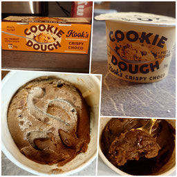 Den Keksteig gab es in Frankreich und davon auch noch mehrere Sorten, wie mit Spekulatius. Ich habe nur zwei gesehen und diese war am interessantesten. Er kann so heraus gelöffelt werden oder noch mal für 10 Sekunden in die Mikrowelle gegeben werden bei 600 Watt. Dann wird er noch etwas weicher. Das habe ich auch gemacht und ich mochte die dennoch kompakte Keksmasse. Sie hatte Zuckerknack und die des Pralines enthalten und der Geschmack war mir vertraut. Ich weiß, aber nicht woher. Ich mochte ihn und fand den kleinen Becher lecker. Er kann mit unseren Keksteigen in Deutschland mithalten.