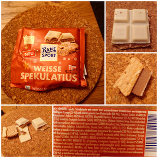 Die neue winter Sorte ist mit eine gewürzten Keks und Creme gefüllt. Ich mag den würzigen Butterkeks, da er der Schokolade was knuspriges gibt. Die Gewürze schmeckte ich eher in der Creme. Es war eine süße würzige Creme. Spekulatius traf es für mich nicht ganz, aber winterlich. Die weiße Schokolade darum passt gut und lies den Gewürzen Platz sich zu entfalten.