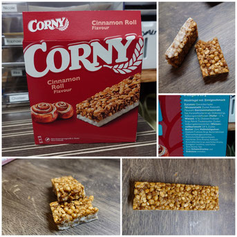 Also cinnamon roll Freund, backe ich sie oft und war erfreut sie als Müsliriegel gefunden zu haben. Es bestand aus der bekannten Müsliriegelmasse aus Getreidecrispies und Getreideflocken. Sie hatten eine weiße Fettglasur mit Zimtgeschmack. Der war sehr lecker und die Müslimasse knusprig, zäh und lecker. Doch nach Zimtschnecke schmeckte es nicht, aber gut nach süßen Zimt.