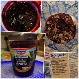 Ich esse gerne ab und an pur oder auf Grießbrei Fruchtkompott und habe die neue Sorte mit Blaubeeren und Holunder ausprobiert. Sie ist recht süß, doch sonst mochte ich sie. Sie schmeckte vor allem nach Heidelbeere, doch auch der Holunder kam durch. Es gibt größere Heidelbeerstücke und kleinen, leicht knusprige Holunderbeeren, was mir gefiel. Ich kann sie mir auch gut mit Vanillesauce vorstellen.