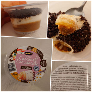 In den Niederlanden habe ich ein paar kleinen Mousse mit Biskuitboden gefunden und habe ein paar zum Probieren mitgenommen. Das Caramel Stracciatella bestand aus 4 Schichten. Ganz unten war eine Karamellsauce. Die lecker süße geschmeckt hatte, darüber war das weiche Löffelbiskuit und dann kam die süße Vanillemousse getoppt mit Schokoladenstückchen. Ich mochte die Konsistenz der Mousse und auch die Cremigkeit. Doch leider wurde Alkohol für die Haltbarkeit benutzt und dieser Geschmack störtet mich. Die Schokoladenstückchen waren recht weich und leicht herb. Sie waren o.k., doch eine bessere knackigere Schokolade hätte den Dessert gut getan. Man kann es essen, doch ich würde es mir schon wegen der Alkoholnote nicht nochmal holen.