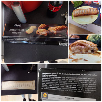 Als ich diesen Strudel im Lidl gesehen habe, beschloss ich gleich ihn mit zunehmen. Er hatte eine Zimtcreme und wurde dazu mit Apfel und Rosinengefüllt. Ich habe ihn dann bei 200 °C Umluft für 35 Minuten gebacken und der rohe Blätterteig ist knusprig geworden. Innen war er saftig. Die süße Apfel-Rosinen-Füllung passte mit den weichen Zimtcreme gut zusammen, weil beides Zimt enthielt. Die Apfelstücke waren aromatisch und weich, wie die Rosinen. Diesen Strudel könnten sie im Sortiment lassen und er lässt sich gut Teigen.