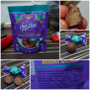 Ich mag zwar Milka Schokolade nicht so sehr, da sie mir immer zu süß ist. Doch diese Kugel sind gut und das liegt an der Füllung. Sie bestand aus Haselnusscreme mit Karamellgeschmack, in der nochmal knusprige, salzige Karamellstücke lagen. Sie passten sehr gut zu der Creme. Diese schmeckte nach Nougat mit etwas Karamellaroma, was verstärkt wurde mit den knusprigen Stückchen. Da störte es mich auch nicht das die Schokoladenhülle, die Milka Vollmilchschokolade war.